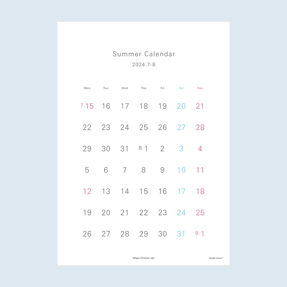 小学生・中学生・高校生が夏休みを過ごす7月中旬から8月末までが一枚になった、シンプルなデザインのカレンダーです。